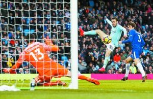 在2017-2018賽季英格蘭足球超級聯賽第29輪比賽中,曼城隊主場以1比0戰勝切爾西隊。圖為曼城隊球員貝爾納多·席爾瓦(中)在比賽中破門得分。 新華社/路透