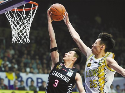 4月15日,遼寧隊球員趙繼偉(左)在比賽中上籃。 |