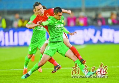 北京國安隊球員張瑀(前)在比賽中防守廣州恒大隊球員郜林。新華社發