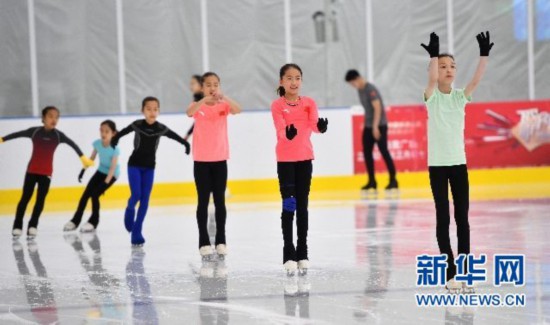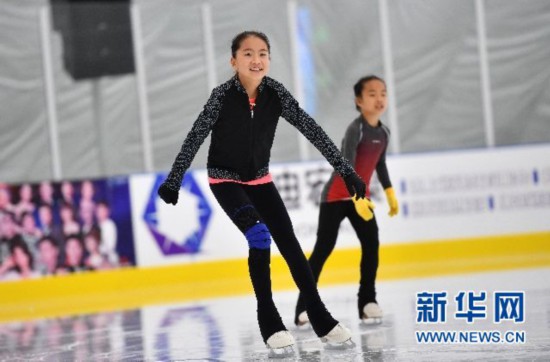 ↑參加海選測試的小運動員們在冰上訓練中。新華社記者郭程攝