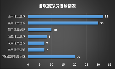 從小組賽進球的球員所屬聯賽分布來看,來自14個國家的21名西甲球員包辦了最多的32粒入球,英超球員打入了30粒進球排名第二,來自五大聯賽的德甲、法甲、意甲球員分別打入了10粒、7粒和7粒,值得一提的是,來自3個國家的5名俄超聯賽球員共打入了8粒進球,排名第4,而來自廣州恒大淘寶的韓國球員金英權是中超球員打入世界杯入球的唯一球員。