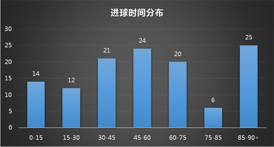 本屆世界杯讓大家印象深刻的是出現了多場比賽的絕殺與絕平的比賽,而從進球時間分布來看,也印證了這一點,據統計,在比賽的85+分鐘進球的數量達到了25粒,占總進球的20.5%,其次是下半場開場后的15分鐘,進球數達到了24粒。