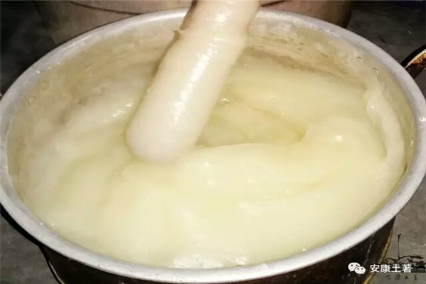 做面魚講究的是熬煮,粉/面下鍋置于煤爐上,用沸水加入不斷攪拌,使粉/面均勻沾水受熱,期間要不停用搟面杖攪拌,要保證粉/面漿煮熟還不粘鍋燒糊,攪拌的力度和方向就全靠多年積累的經驗。熬煮成熟的包谷面漿,稀稠得恰當好處,過稀掉在鍋里難以成形,過稠壓制過程就格外費勁。反復加沸水三次并充分攪拌勻凈后,沸水才能把粉/面煮熟。