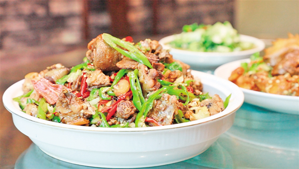 嵐皋縣三彩閣——三彩辣子雞一盤辣子雞,由雞肉與新鮮辣椒炮制而出,透著嵐皋人性子里的爽辣和厚道,紅翠辣椒、醬黃雞塊,香氣撲鼻、香辣可口,吃的人……