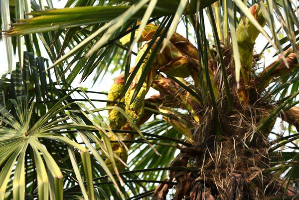 到了80年代初,當(dāng)?shù)貢r興起棕床,睡起來柔軟又有彈性,舒適又隔潮氣,家道殷實人家相繼都拆掉了稻谷草鋪就的架子床換成美觀新潮的棕床,后來我才知道,做一張床,除了木料和繩子,還得十幾塊工匠錢,記得父親在陡坡上搬樹摔了一跤腰部受損,天氣一變就不停地呻吟,姐姐便使喚我們割遍自留山的棕,勉強織了一張床,是夜,父親睡得很安穩(wěn)。棕樹開的花也很有特點,花形呈佛手狀,花籽如粟米子樣金黃亮色,味道有點淡淡的苦,婆在世時常說棕樹花燉豬心,娃娃吃了補心肺,長記性,我上學(xué)時再生僻的詩文,看過一遍就爛熟于心,或許與吃過此湯不無關(guān)系,我在想,棕花入藥對治愈新冠肺炎應(yīng)該療效不錯,它也是一副神奇的中藥方劑。