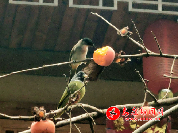 山垰間,一樹焰火似的紅柿子,掛在天穹,迎風搖曳,恰巧,兩只山雀停住枝丫間,兩眼凝視啄開紅彤彤的鮮瓤,不知道是望柿,還是炫酷孤傲的“旺勢”,樣子煞是迷人。H5q安康新聞網