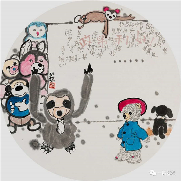 對于政策性的以及企業生產經營活動,在這批作品中也有一定的表現。表現這種內容是有難度的。創作中,我設定了毛絨玩具與政策的“互動”:譬如,我在一幅畫中,一群玩具的背影在觀看“安康六條”,而“安康六條”的縫隙,畫了許多活潑淘氣的玩具,透露出毛絨玩具產業的興旺發達。另一幅是一些毛絨玩具在好奇地觀看“看板”上的各種支持政策,一個調皮的猴子趴在看板頂頭給大家講解政策,擬人化、趣味性、含蓄、有情境,應該解決了這類“難題”。iyT安康新聞網